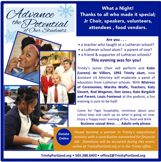 This evening was a celebration of 128 years of Lutheran education in the Portland area. Many educators who have been in that ministry were in attendance. See Photos in ‘Read More.’