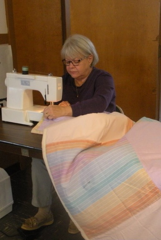 Quilt tops are made at home by anyone who likes to sew. Kits of fabric and instructions are provided in a basket in the church narthex. The kits can be “checked out” and returned to the basket upon completion.